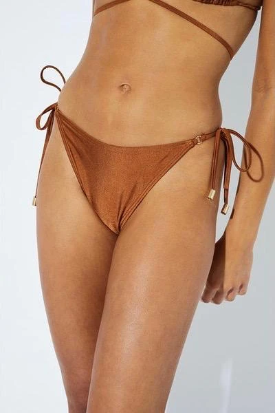 Obsessed, is an understatement! We are totally in love with this burnt orange, brown, metallic swimsuit! Featuring adjustable tie sides with gold-tone hardware and ruched fabric on back. Pair with the Cannon Wrap Triangle Top to complete the bikini set.