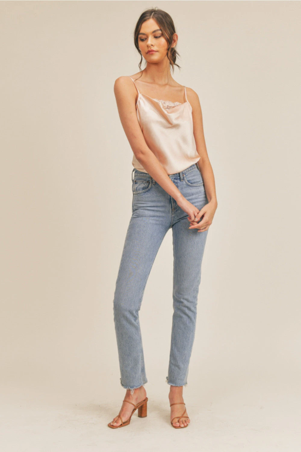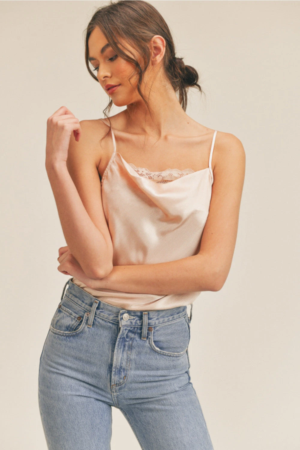 We are loving the minimal yet glam details of the Champagne Dreams Cami! This lightweight satin cami top has lovely eyelash lace trim across the front neckline and back, a cowl neck supported by adjustable spaghetti straps, and a relaxed bodice.