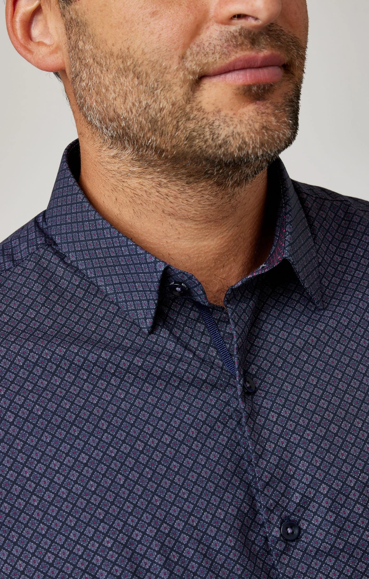 Step out in-style with the Diamond Navy Geo Performance Long Sleeve! Soft woven fabric, with a navy diamond print throughout, shapes a collared neckline with an under-collar summary-down system, and long sleeves with summary-cuffs. The performance based cotton fabric provides a natural temperature control to keep you dry and cool throughout any season. Pair with denim for a casual style or dress it up with a tailored pant.