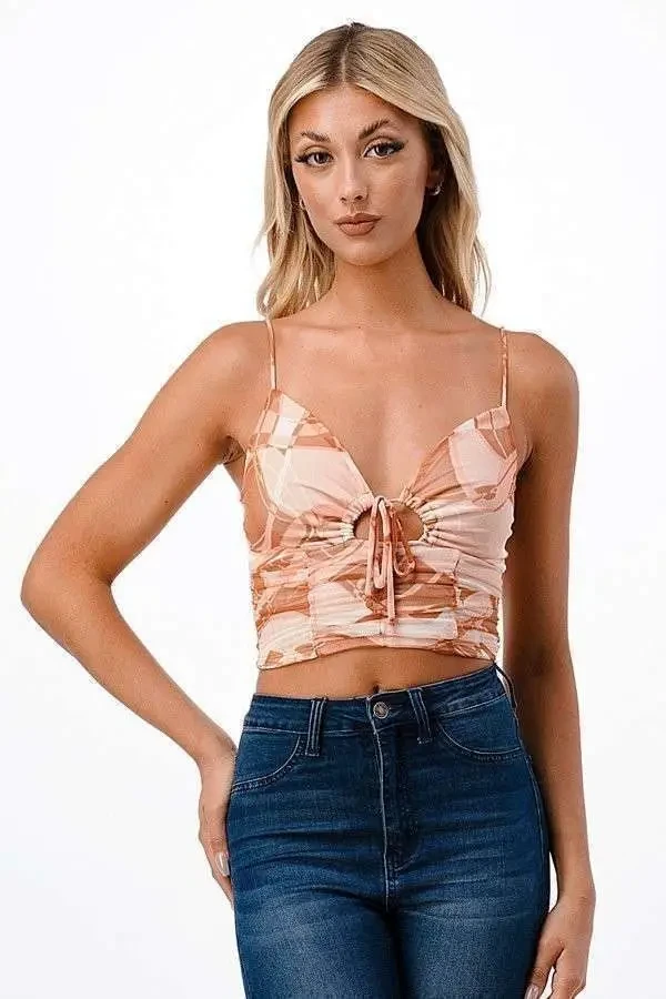 Add a little vintage flair to your look with the Groovy Ways Mesh Cami Top! Stretchy mesh fabric, with an adorable marble print throughout, shapes this flattering cami with a V-neckline supported by adjustable spaghetti straps. A flirty, drawstring cutout falls to a ruched waist before ending at a cropped hem. Pair with denim or shorts for a sweet summertime style!