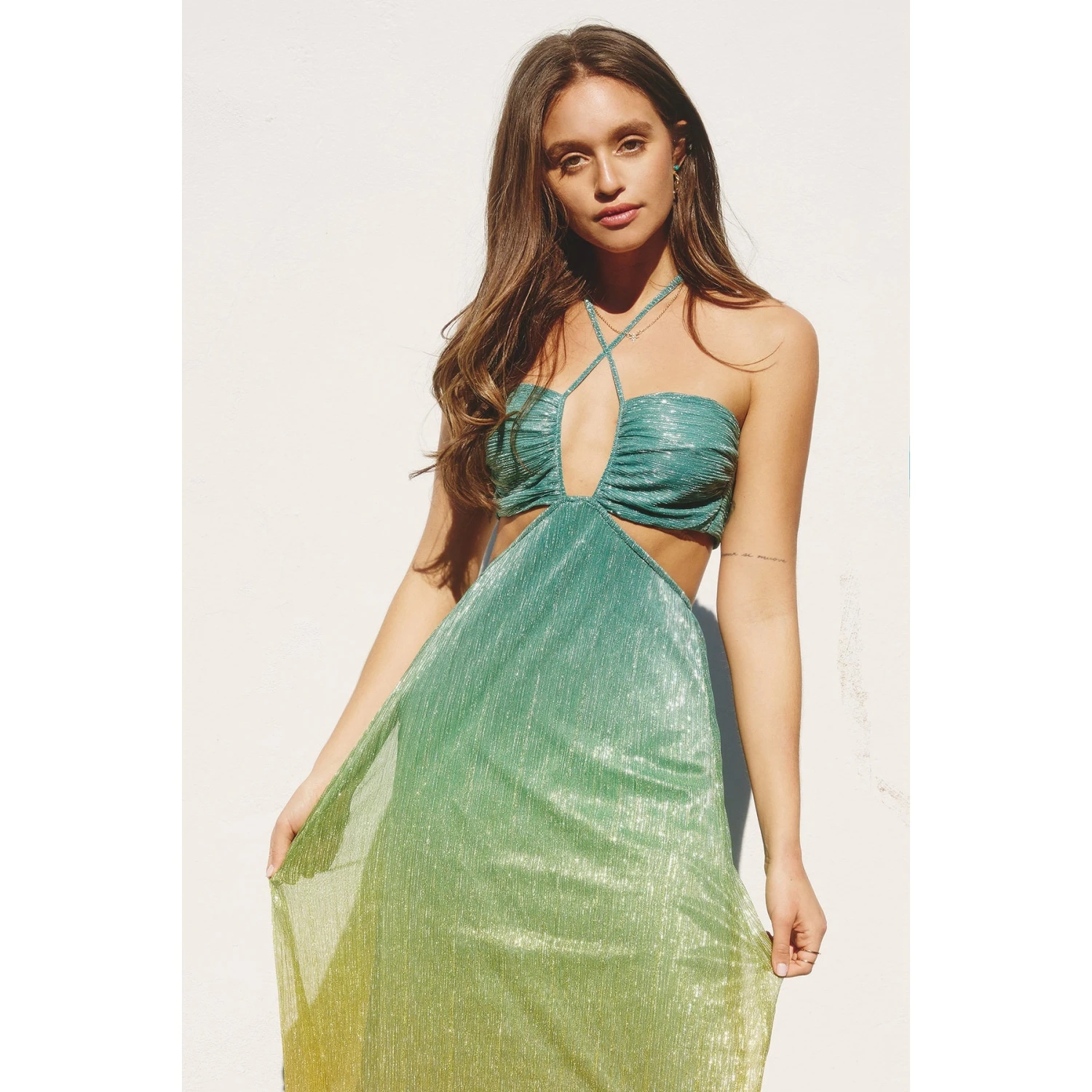 It will be clear just how glamorous you are in the Hera Ombre Cutout Midi Dress! This sparkly midi dress boasts a sheer overlay atop a stretch knit liner, in a stunning ombre print. Slender drawstring ties form a halter neckline and continue down to create a plunging cutout bodice with sash ties that secure at back. A gathered (under bust) band continues to a cutout waist that tops a figure-skimming skirt with a midi hem.