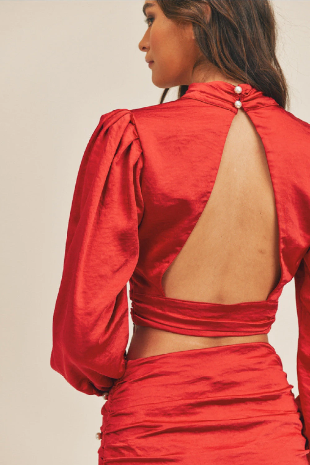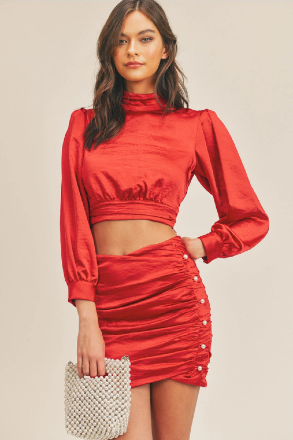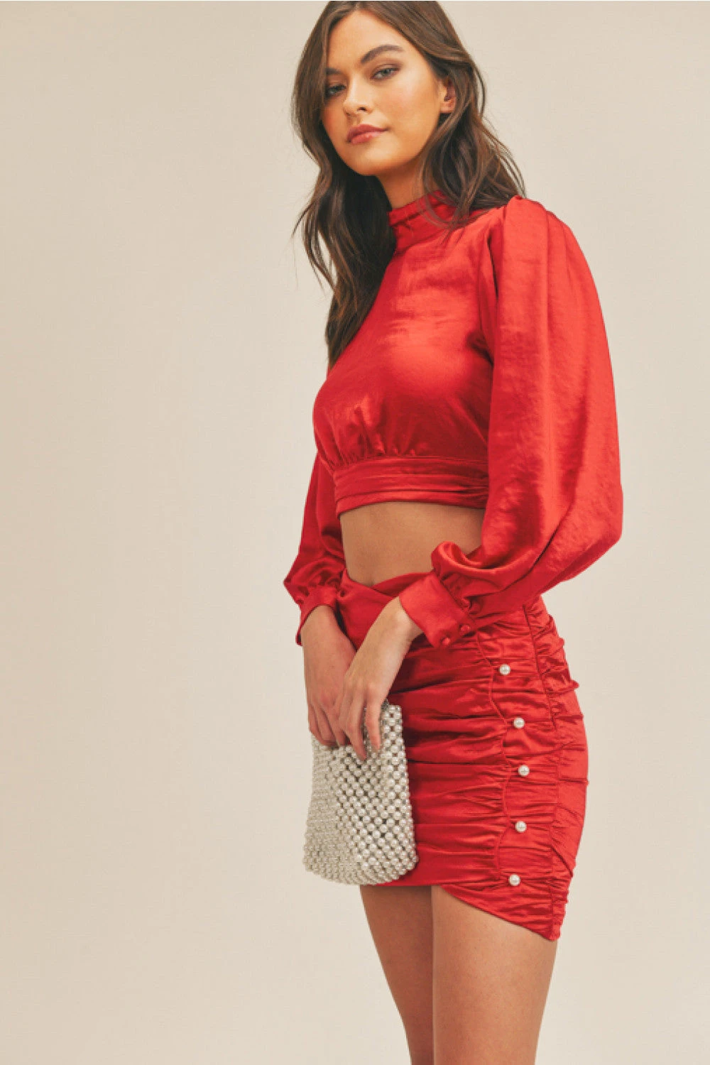 Add the Holly Days Mini Skirt to your cart ASAP, and don’t let it get away! Sleek woven satin creates this sexy mini skirt that has an overlapping bodycon silhouette, ruching detail throughout, and side pearl accents. Pair as a set with the Holly Days Crop Top and your favorite heels for a red hot look!