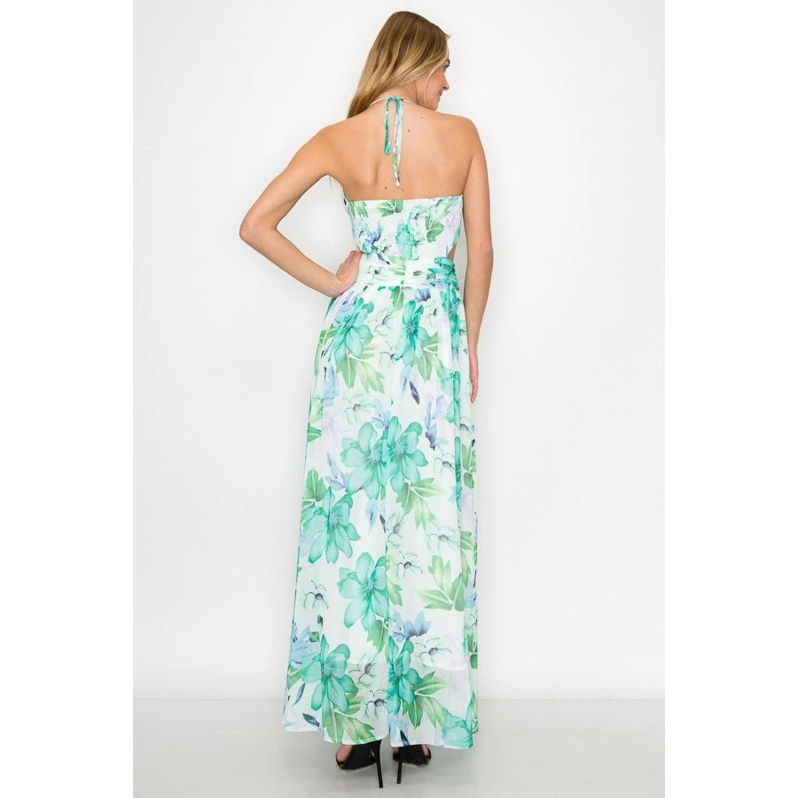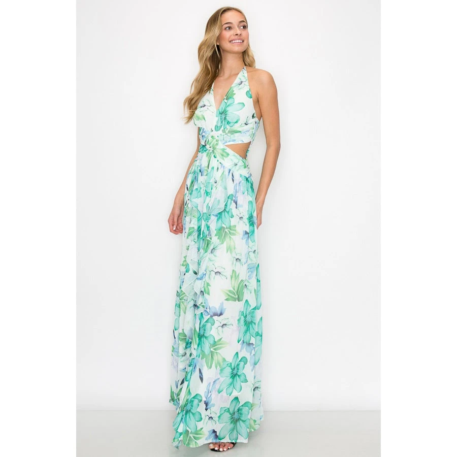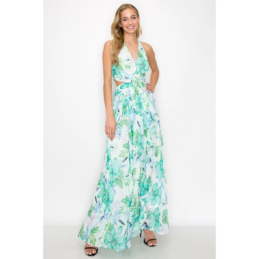 We think the Floral Goddess Cutout Maxi Dress is the perfect choice! Stunning chiffon, with a white, green, and blue floral print, shapes this dress that has a halter V-neckline, fitted bodice and a crisscrossing waist (with O-ring detail) that transitions into sexy side cutouts. A smocked back tops a cascading maxi skirt with ruffled detail before ending at a full-length hem.