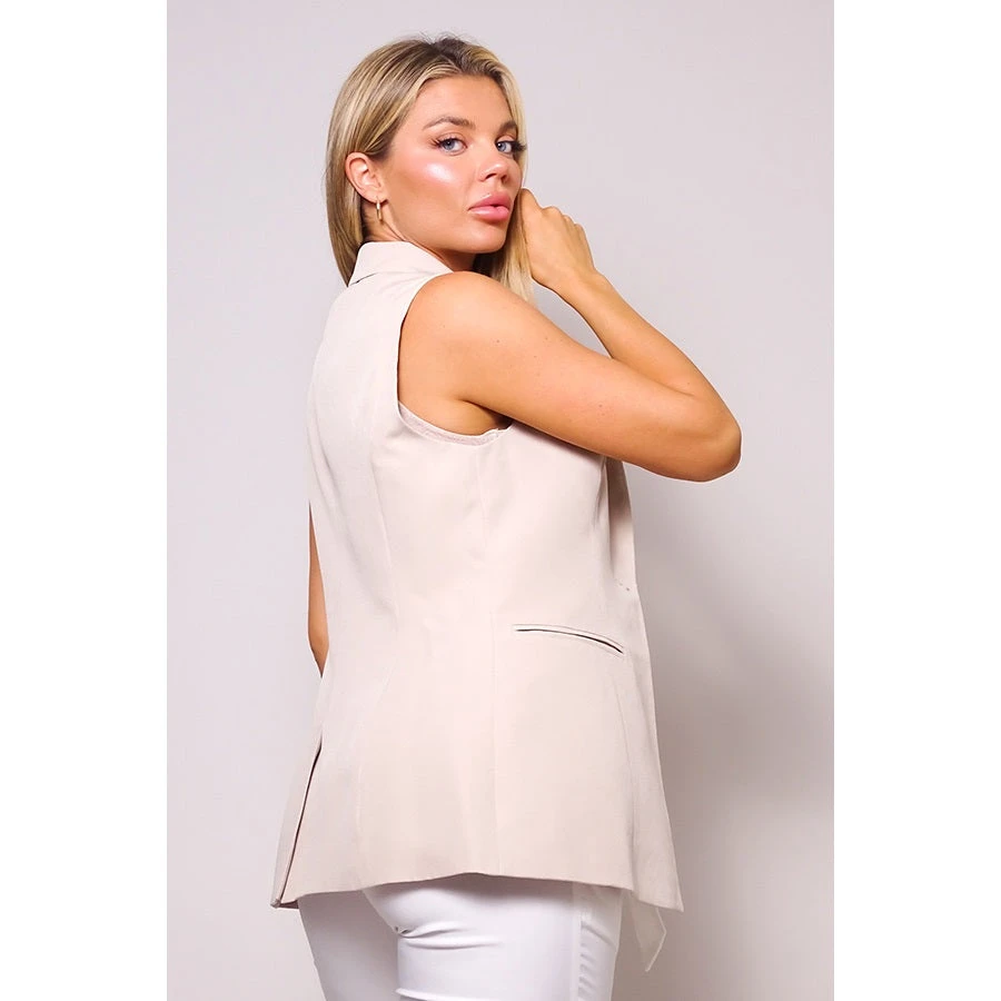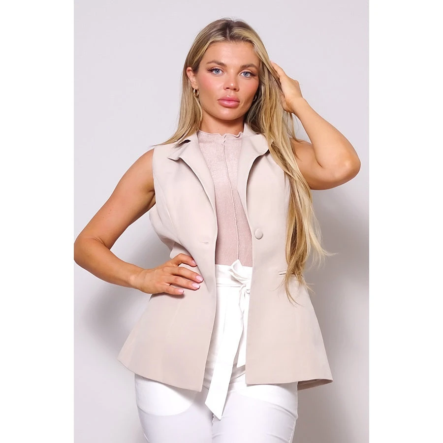 Never worry about looking stylish when you have the Kendall Sleeveless Blazer! Sleek woven fabric shapes this chic blazer with a collared neckline, notched lapels, and padded shoulders. A seamed, sleeveless bodice features faux welt-pockets, and a front summary closure.
