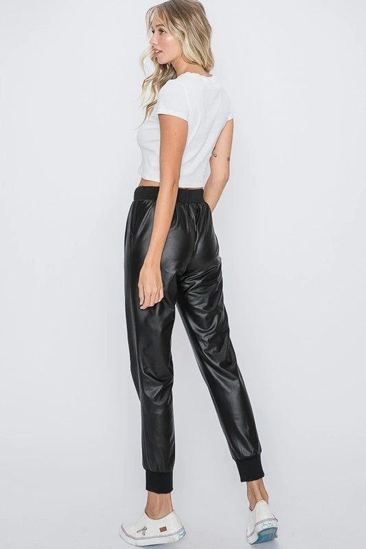 The Laina Black Leather Joggers are almost too good to be true! Soft and slightly stretchy vegan leather shapes these jogger pants that have a high-waisted fit, drawstring waist (with a bit of elastic), side seam pockets, and a tapered pant leg that falls to an ankle-length elasticized hems.