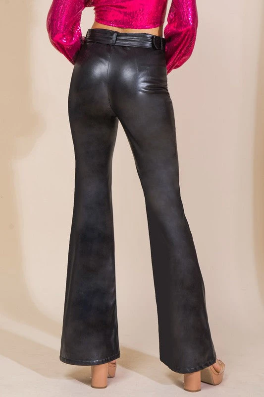Whether you dress them up with heels or keep it edgy with boots, you’ll always be on-trend in the Level Up Black Vegan Leather Flare Pants! Ultra-soft vegan leather shapes a high-waisted silhouette with belt loops and a (removable) fabric-matching belt with a covered rectangular buckle. Center-seam detail accents the front of the retro silhouette before falling to flared, ankle-length hems.