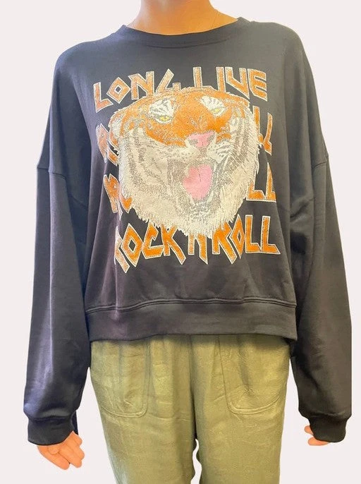 Pair the Long Live Rock N’ Roll Sweatshirt with ripped denim and sneakers for a casually cool ‘fit! This ultra-soft, cotton-blend knit sweatshirt will be your favorite to wear this season with its classic crewneck, drop shoulders, and long sleeves with fitted cuffs. The relaxed, boxy-fit bodice boasts a trendy tiger graphic that reads “Long Live Rock N’ Roll” before ending at at banded hem.