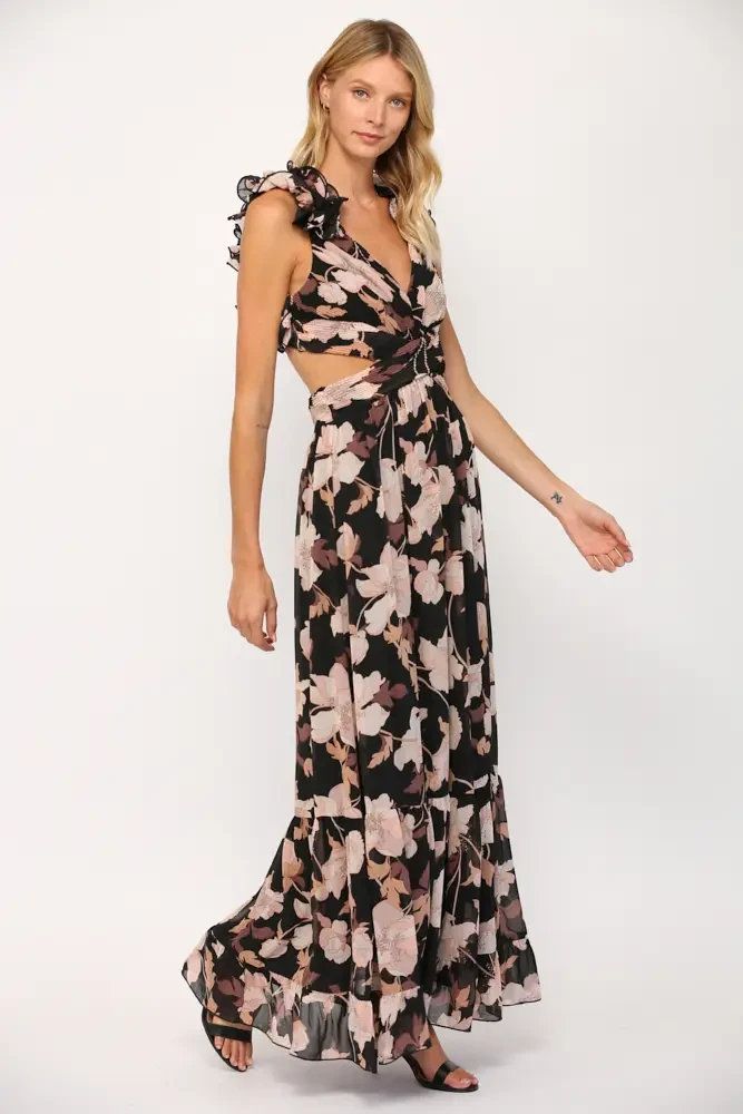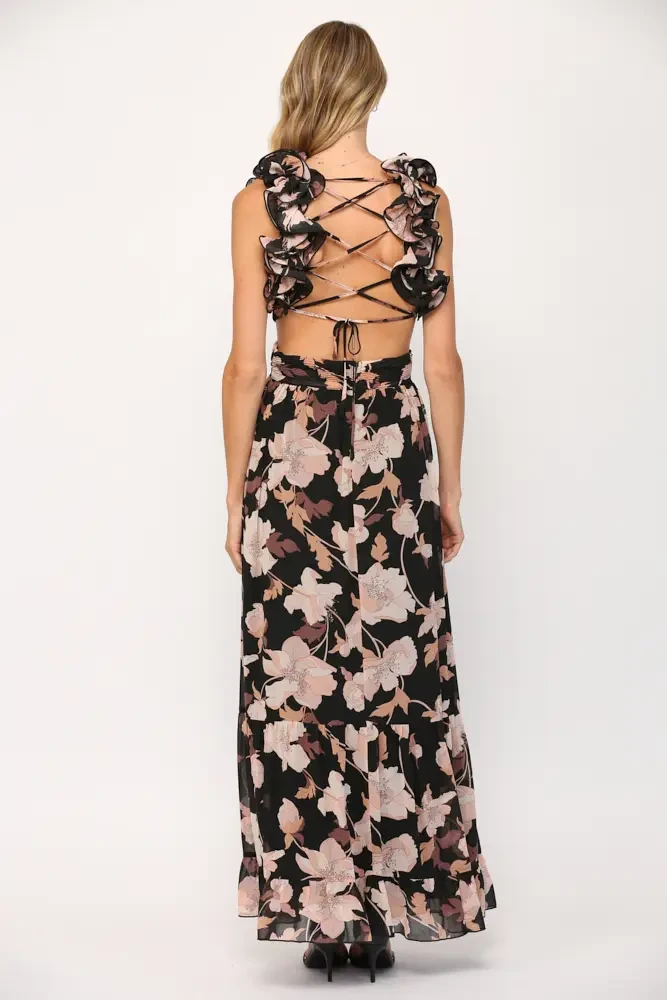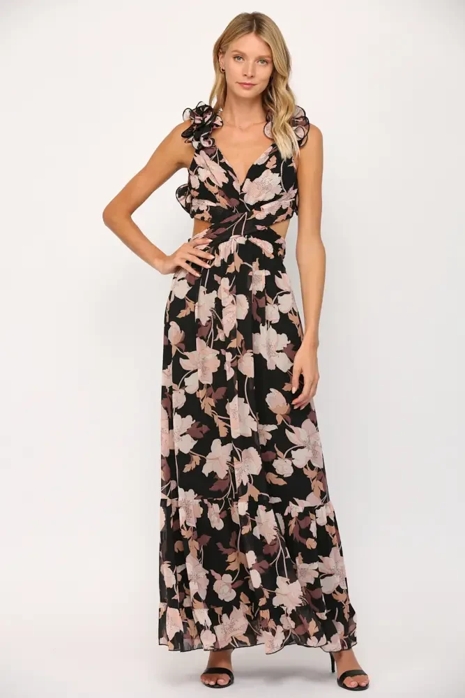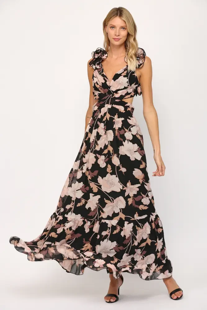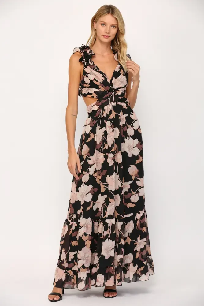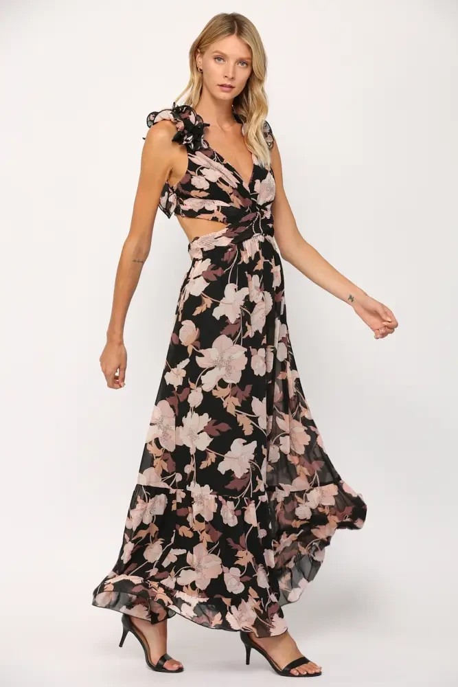 We’re swooning over the Paris Nights Floral Ruffled Maxi Dress! Pleated chiffon, in a stunning floral print, sweeps into a plunging V-neckline and fitted bodice, while a crisscrossing waist transitions into sexy side cutouts. The star of the show is the wire-ruffled shoulders that cascade from front to back, while the sultry, crisscrossing back ties create a fully adjustable bodice.