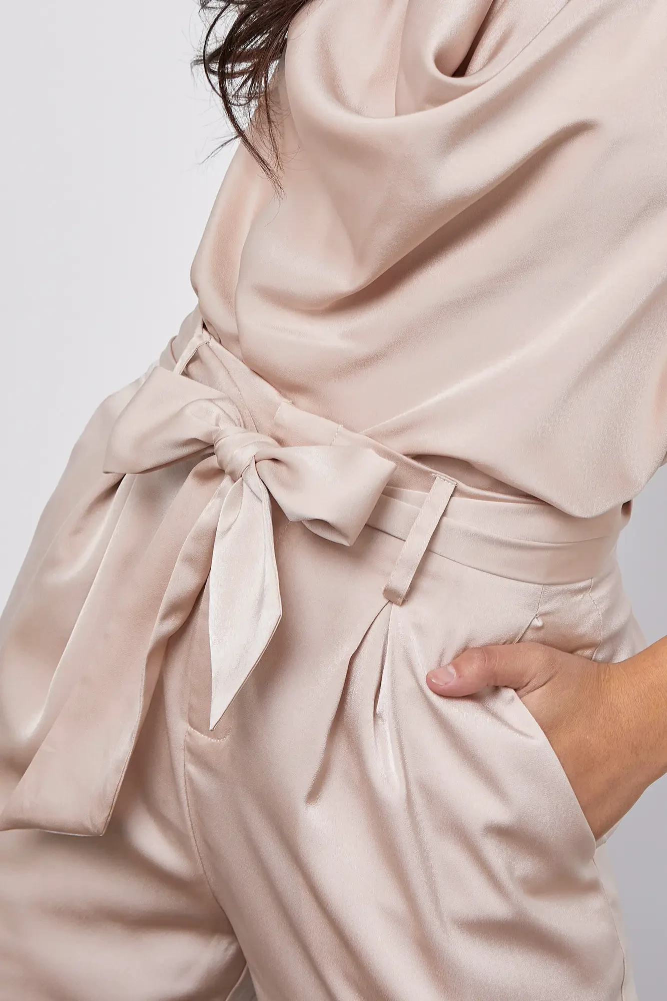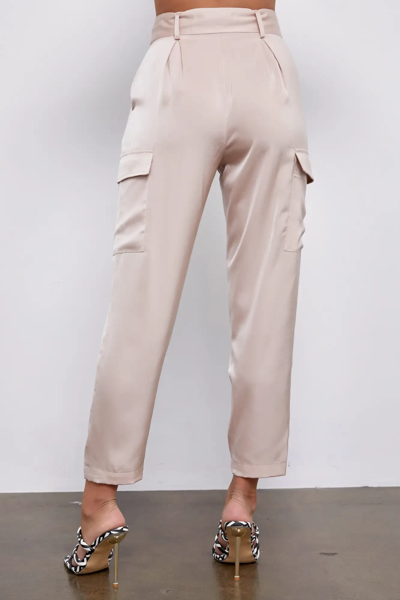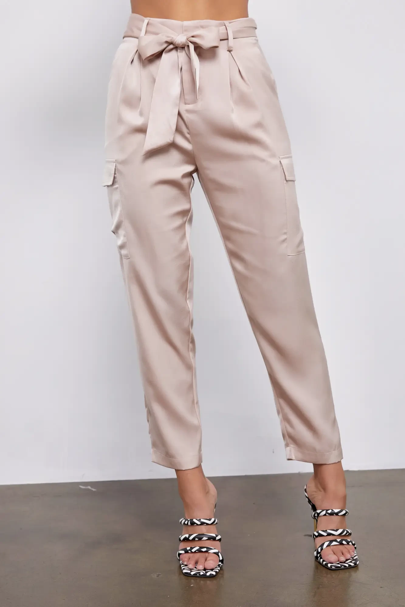 Sleek woven satin shapes these trendy pants that have a high-waisted fit, belt loops, front side-seam pockets and a matching sash-tie belt. Tapered pant legs feature light seaming from the waist, side cargo-style pockets, and end at ankle-length hems. Complete the set look with the Pure Decadence Cowl Neck Top.