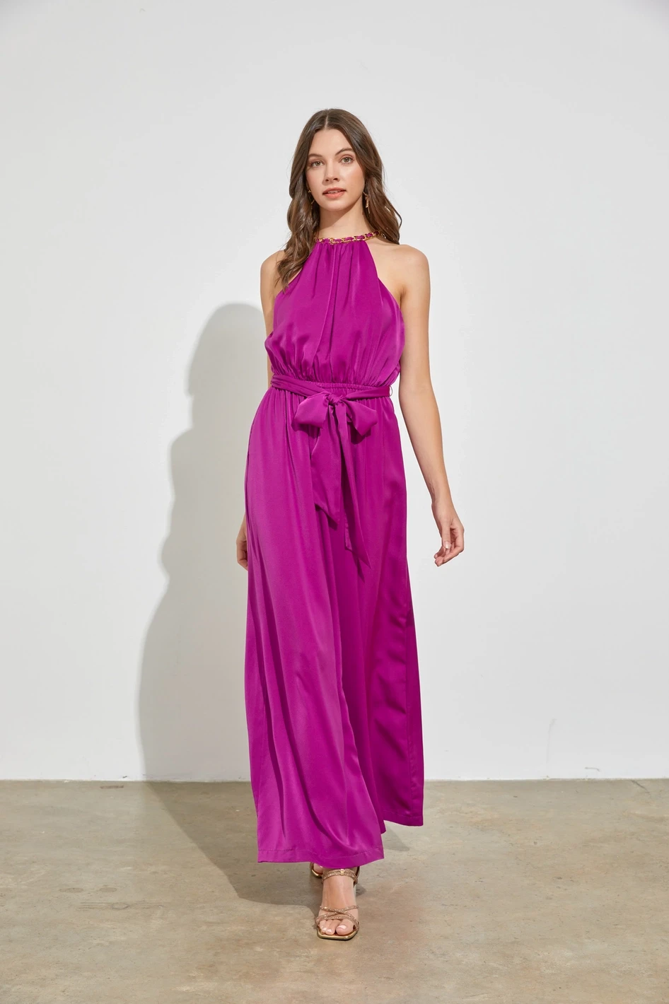 You’ll feel like total royalty in the Radiant Arrival Orchid Wide-Leg Jumpsuit! Luxe woven satin shapes this stunning jumpsuit that has a halter neckline (with gold chain detail) and a sleeveless bodice with gathered fabric detailing. The high, fitted waist features side-seam pockets and a matching sash before continuing into wide, pleated pant legs that end at ankle-length hems.