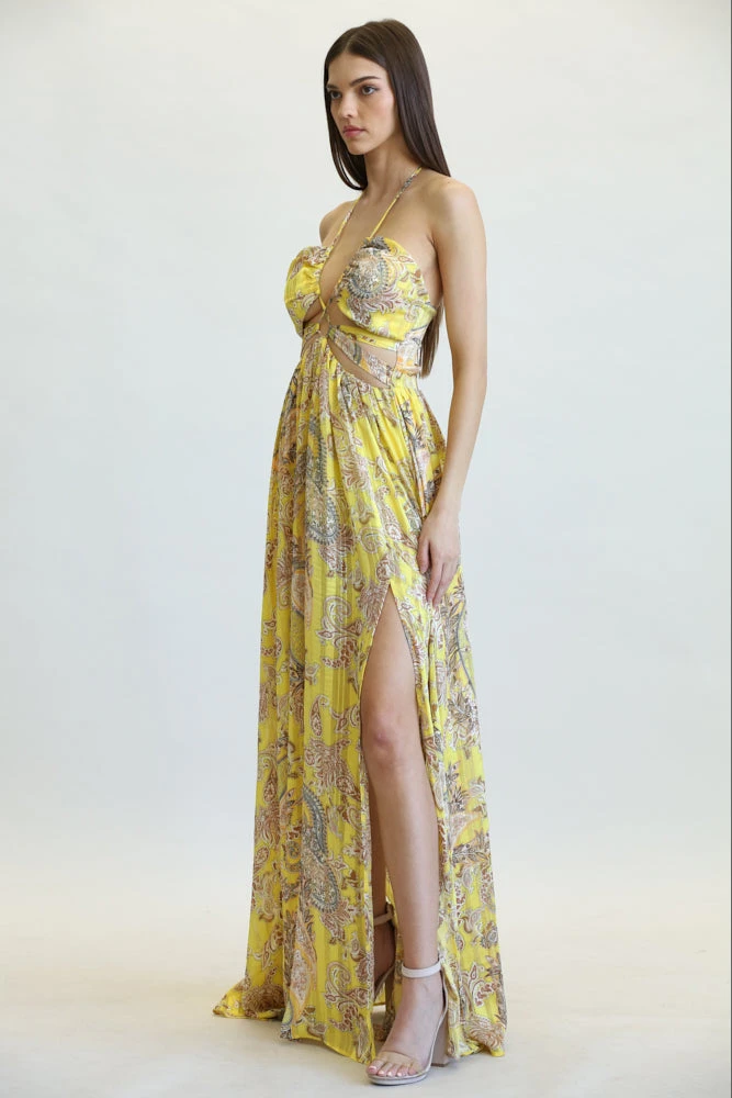 For a dress that’s sure to make you glow, look no further than the Ray Of Sunshine Cutout Maxi Dress! Chic paisley print and stunning gold lurex, sweeps across lightweight chiffon, shaping a halter neckline and drawstring tie that creates multiple sexy cutouts at the center of the fitted, backless bodice. High waist tops a flowy skirt that falls to a tiered maxi hem with leg slit.