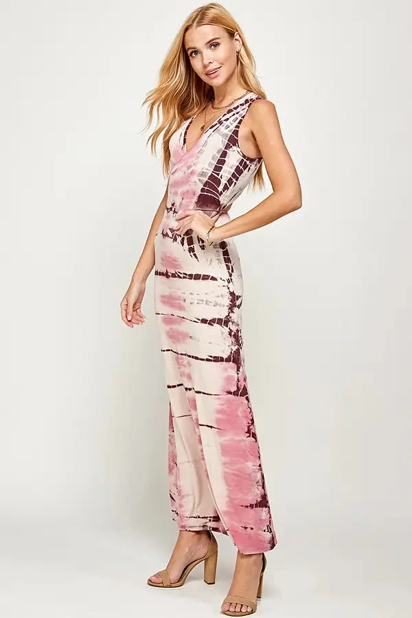 Get in touch with your flirty side in the Rose Kissed Tie Dye Maxi Dress! Soft and stretchy knit, in a rose tie-dye print, shapes this stunning maxi with a V-neckline supported by wide shoulder straps that cross on back. The fitted, sleeveless bodice extends into a figure-flattering maxi length skirt.