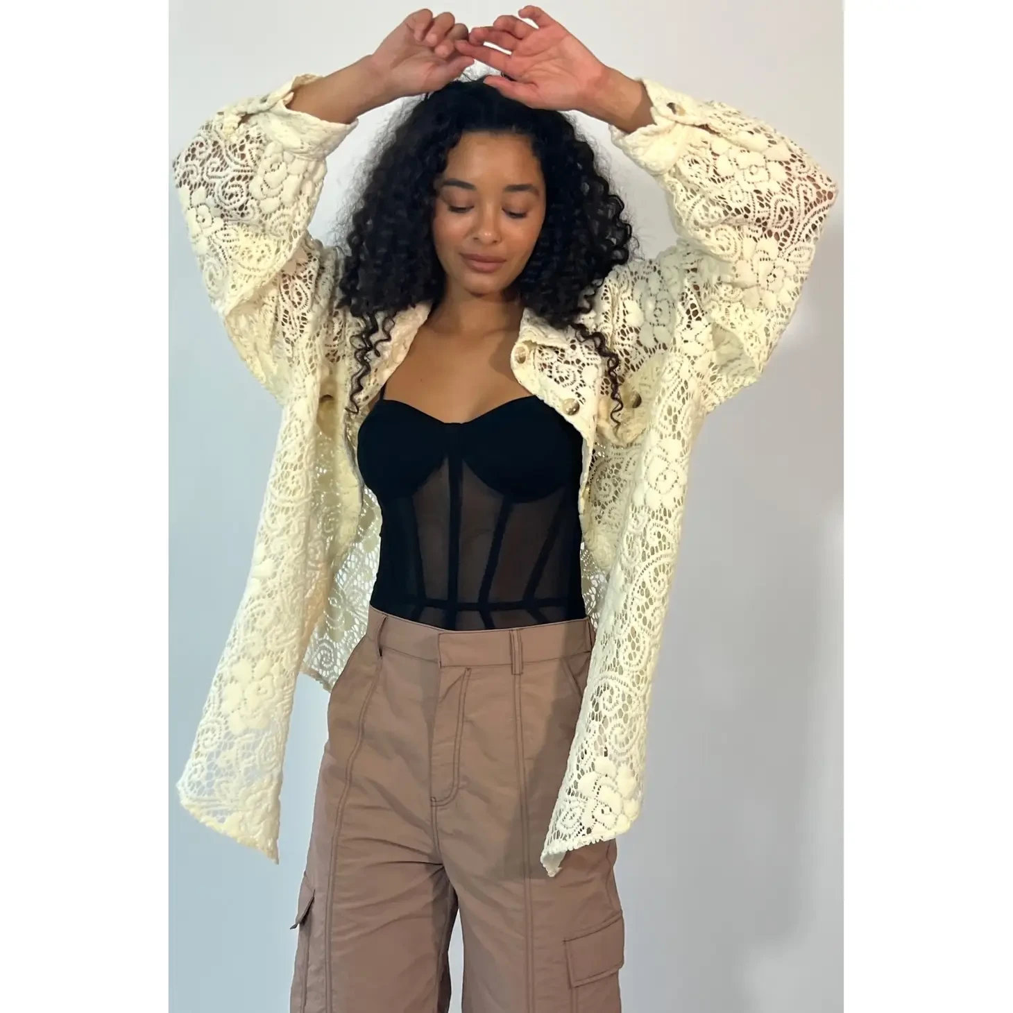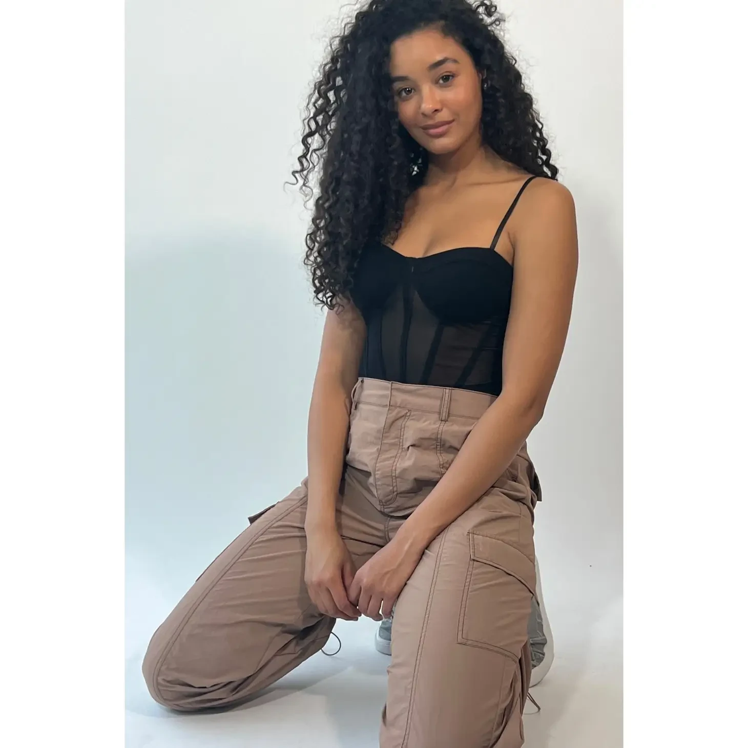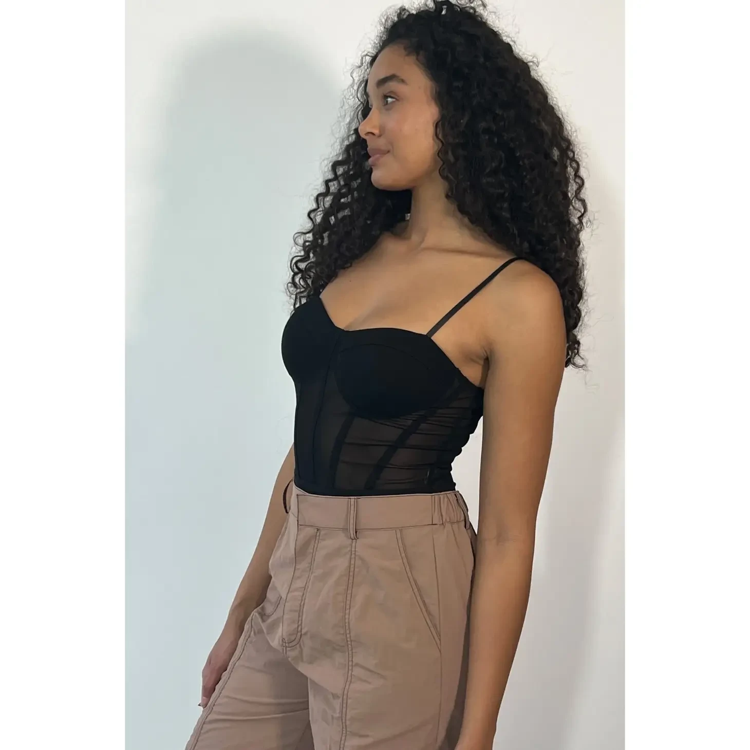Turn any night out into a sultry one with the Total Slay Black Corset Bodysuit! Stretchy, (partially) sheer mesh shapes this sexy bodysuit that features a sweetheart neckline, corset-inspired seaming, adjustable shoulder straps, and a built-in padded cups. A fitted silhouette ends at thong bottoms with snap closures.