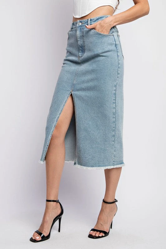 Fall in love with the Trend Seeker Vintage Blue Denim Midi Skirt! Soft and stretchy fabric shapes this iconic midi skirt that features a high-rise, belt loops, four-pocket cut, and a top summary closure atop a zip fly. The figure-skimming silhouette features a flirty, front-slit before ending at a midi-length raw-hem. Pair with a bodysuit or a sweater for an on-trend style!