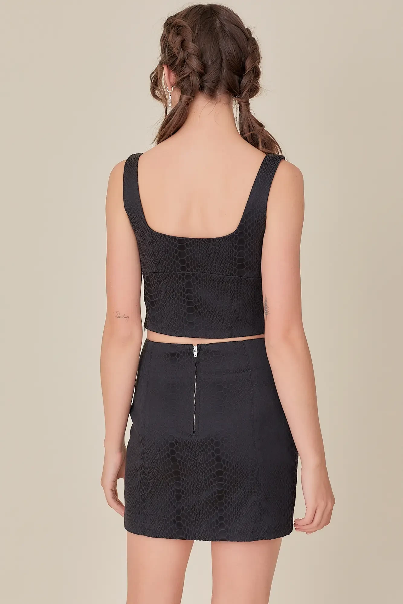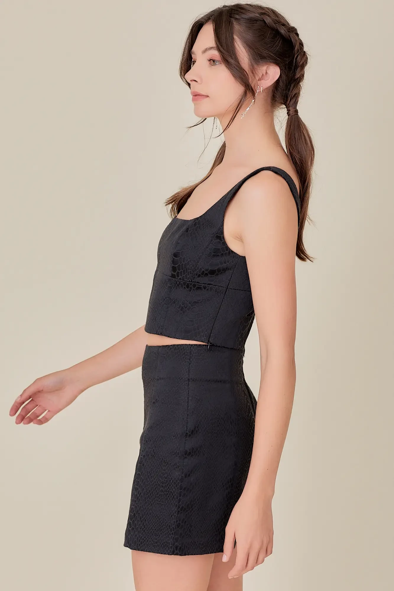 No matter which way you style the Wild Card Snake Print Bustier Top, you’ll always be coming up first on the best dressed list! Soft and stretchy woven jacquard, in a trendy snake print, shapes a square neckline supported by wide, tank straps. The fitted bustier-style bodice (with supportive seam detailing) ends at a cropped length hem. Complete the set look with the Wild Card Snake Print Mini Skirt.