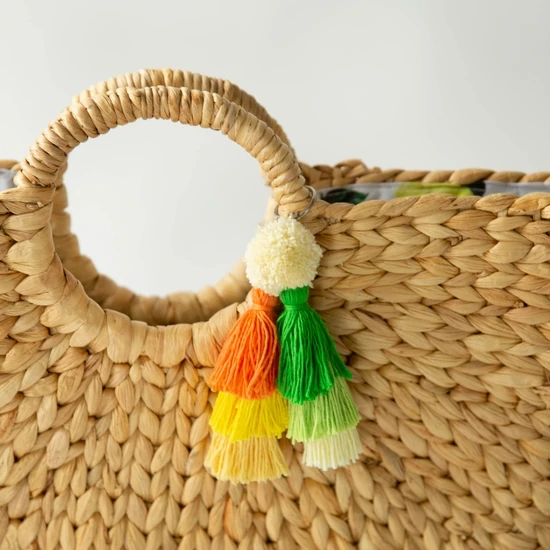 The perfect summer accessory…. this woven hyacinth tote can be your beach bag, or your farmers market bag, or your throw everything in it bag!! The exterior has structure so will hold its shape nicely, and a little fun surprise on the inside with printed patterns. Matching poms on the exterior give a fun little ‘punch’!